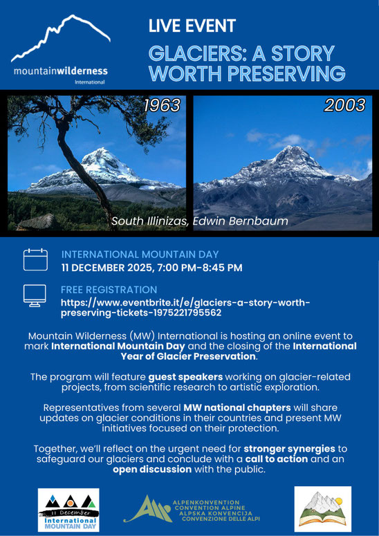 Am 11. Dezember feiert Mountain Wilderness International den Internationalen Tag der Berge mit einer Online-Veranstaltung unter dem Titel: "Glaciers: A story worth preserving". Es werden Gastredner vorgestellt, die an gletscherbezogenen Projekten arbeiten, von der wissenschaftlichen Forschung über die künstlerische Erkundung bis hin zu Vertretern nationaler Sektionen von Mountain Wilderness (MW).